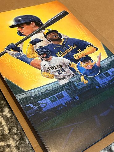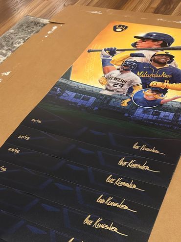The Milwaukee Brewers have printed an exclusive, limited run of 75 art-variant prints of the Official 2025 Home Opener/Opening Day poster. Please note the "art-variant" posters feature only the artwork; The Home Opener text and details of the event will not be printed on the poster. The image above is representative of what the poster will include, however, please be aware the colors may vary slightly due to the printing process (see images of the posters below). The posters measure 16" x 24" and each will be hand-numbered (out of 75) at the bottom left corner and hand-signed at the bottom right. If you have any questions please feel free to reach out to me through the Contact page.
